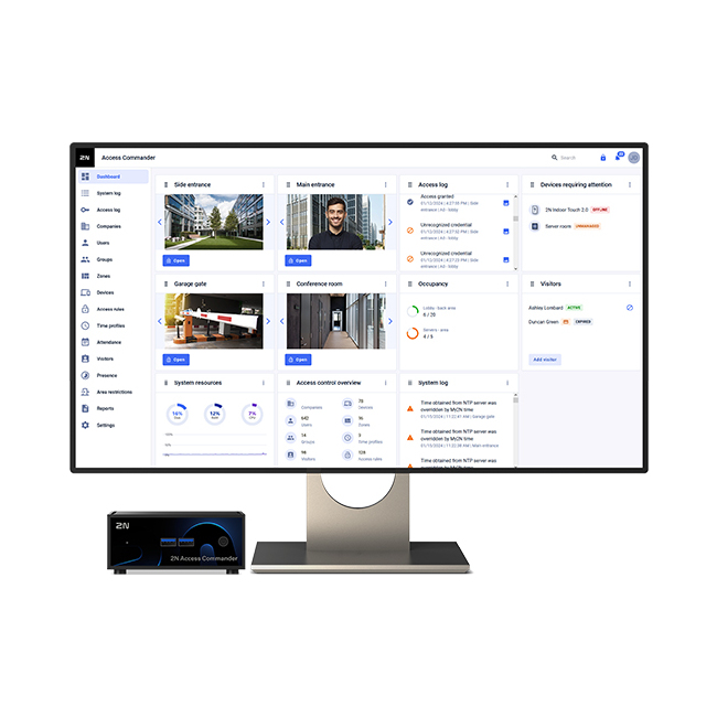 The 2N Access Commander Box 2.0 is a powerful minicomputer that comes with pre-installed software to allow you to manage your access control system. You don’t need your own hardware or access to an existing server. Just unbox it, plug it in, and start managing!
